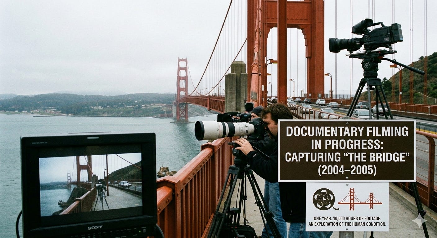 In 2006, a documentary film by Eric Steel spanned one year of filming at the Golden Gate Bridge in San Francisco. The documentary filmed every part of the bridge, from the people who crossed it to several suicides that occurred there.
